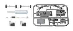 Het pakket bevat mechanische onderdelen, carbonpapier, aluminiumpapier, stof, motor, druppelaar, schroeven, wielen en gedetailleerde instructies.