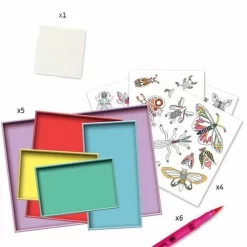 Het pakket bevat mechanische onderdelen, carbonpapier, aluminiumpapier, stof, motor, druppelaar, schroeven, wielen en gedetailleerde instructies.