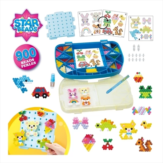 Deze complete set Aquabeads bevat meer dan 900 kralen in 24 kleuren, draagkoffer met flip-tray, Aquabeads-pen, sproeier, creatiebord, bevestigingspinnen, patroonvellen en een handleiding. De patroonvellen bevatten een konijn, dolfijn, dinosaurus, regenboog, ijsje en andere motieven die kunnen worden gemaakt door de meegeleverde sterren-, effen – en juweelparels op de fliptray te plaatsen.