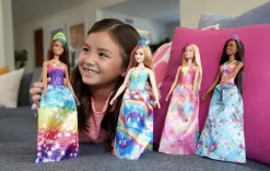Prinsessenpoppen van Barbie Dreamtopia laten dromen uitkomen in fantastische outfits met kleurrijke elementen! Deze Barbie prinsessenpop heeft een speciale outfit voor een bijzondere gelegenheid, met een sprankelend en een levendige rok met stralende print. De lok in haar haar zorgt voor extra kleur, terwijl de felgekleurde diadeem haar sprookjesachtige look afmaakt. Je kunt dromen wat je wilt met deze Barbie prinsessenpop, want als je op reis gaat naar Dreamtopia word je wakker in een wereld waar dromen uitkomen! Liefhebbers van sprookjes kunnen alle poppen en accessoires van Barbie Dreamtopia verzamelen om hun eigen sprookjeswereld te bouwen en hun dromen waar te maken.