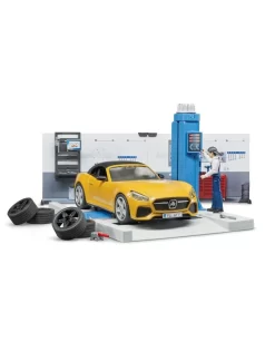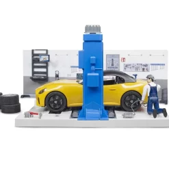 Autowerkplaats van Bruder. Deze set bevat een Roadster, een speelfiguur, een extra set wielen, een hefbrug, gereedschap, wanden en achtergrondelementen.