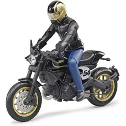 Speelset van Bruder bestaande uit een Ducati Scrambler Desert Sled motor en een speelfiguur met motorpak en helm.