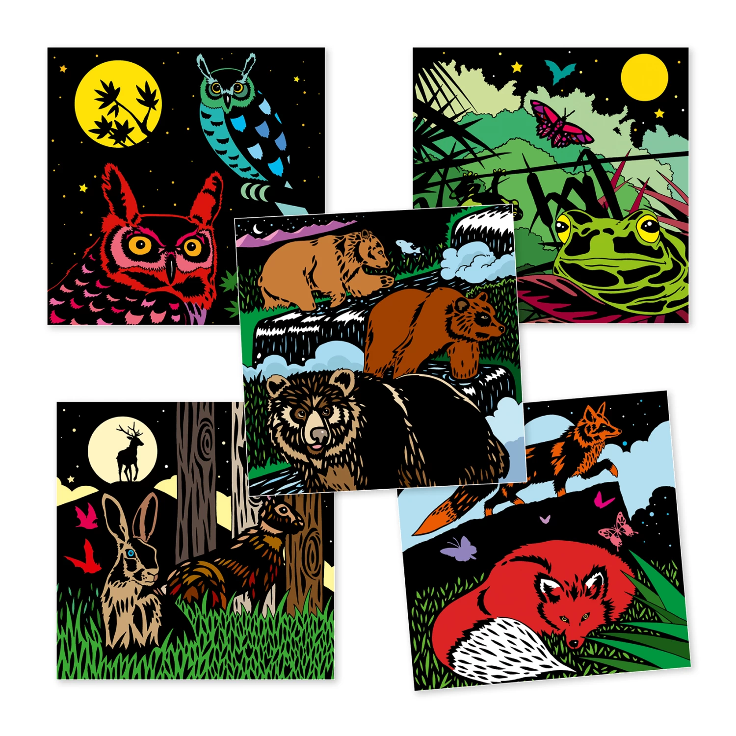 Maak prachtig schilderijtjes met deze bijzondere kleurplaten in het thema “het bosleven” van Djeco. Kleuren zonder buiten de lijntjes te gaan.