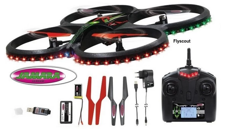 DeĀ Jamara Flyscout Compass Quadcopter Drone heeft nog meer in petto voor de liefhebbers. In het donker geeft de ingebouwde LED-verlichting een schitterende lichtshow in de kleuren groen en rood. Deze kleuren zijn instelbaar en in het donker heeft u een prachtig zicht op uw Jamara drone. DeĀ Jamara Flyscout Compass Quadcopter met LED & Camera is simpel te besturen dankzij de 4-kanaals 2,4 GHz zender met LCD-scherm. Dit scherm van de zender is verlicht zodat u ook in het donker goed zicht heeft. Met de turbo-functie kunt u de drone een flinke boost geven qua snelheid en middels de stunt-mode kunt u salto’s en flips maken. De Jamara quadcopter is het gemakkelijkst te besturen in de standaard mode.Ā