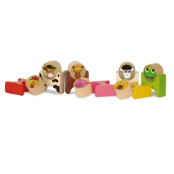 De ronde blokjes met de kopjes van bekende dieren kunnen geplaatst worden op de vierkante blokken met halfronde uitsparingen. Het stimuleert de motoriek en de oog-hand coordinatie.