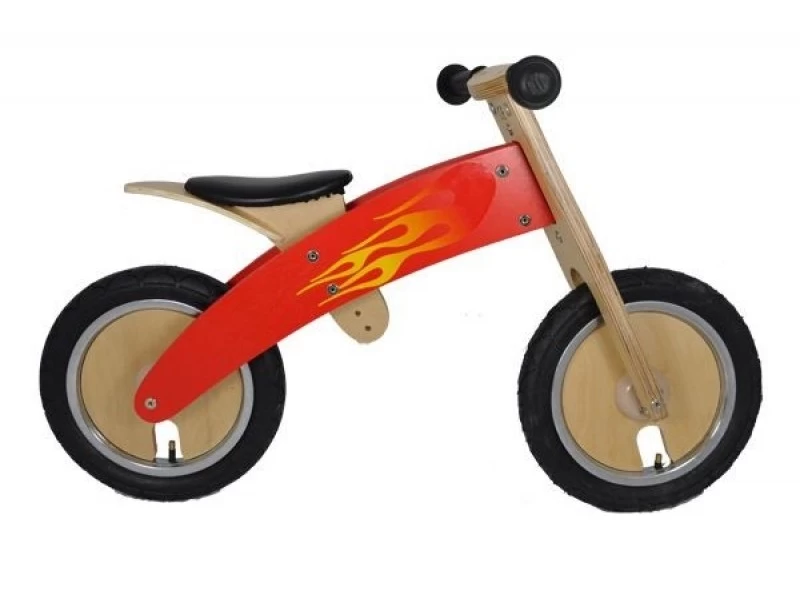 Mooie houten loopfiets in de kleur rood. Er zijn 2 stickersets (vlinders en vlammen) waarmee deze versierd kan worden.