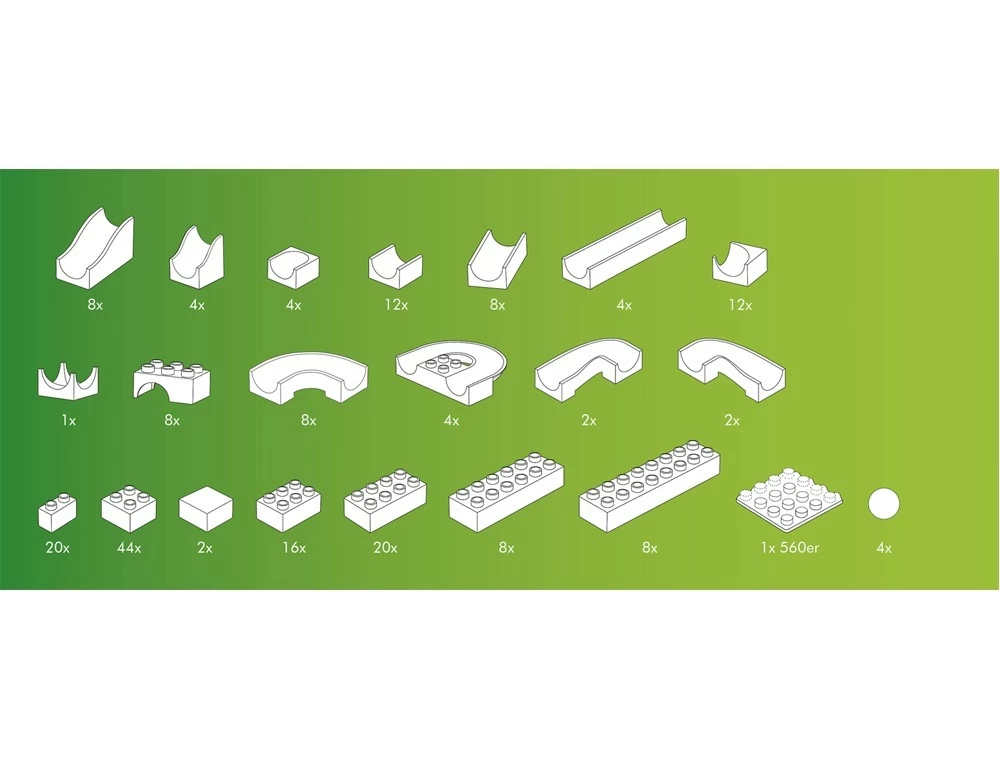De basisdoos is perfect voor beginnende knikkerbaanontdekkers. Die bevat alles wat nodig is om spectaculaire knikkerbanen te kunnen bouwen: twee grondplaten, heel veel baanelementen, witte constructiebouwstenen, knikkers en natuurlijk een uitgebreid geĂŻllustreerde handleiding. 106-delige set biedt oneindig veel mogelijkheden voor oneindig veel plezier.