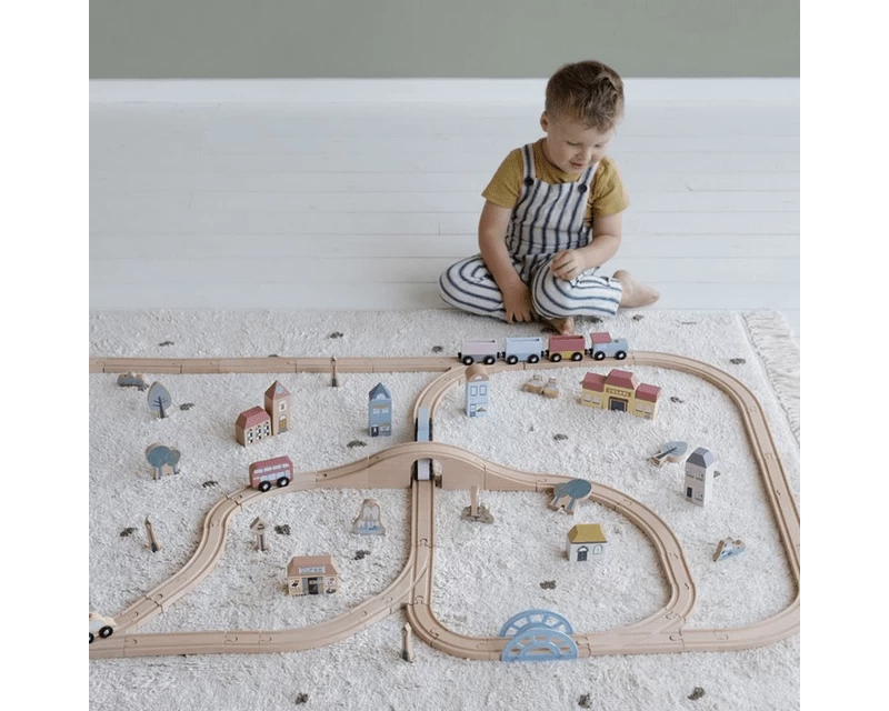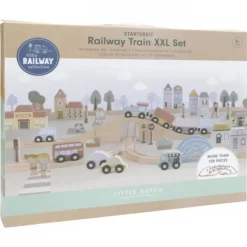 Ga op eindeloze avonturen met de houten treinbaan van Little Dutch. Stap op de trein, de bus, de taxi of in de auto en verken de stad. Met meer dan 100 onderdelen, biedt deze set veel creatieve opties om telkens weer nieuwe combinaties te bouwen. De set bevat een locomotief met drie wagons, rechte rails, bochten, een brug, verschillende gebouwen, auto’s, personen, bomen, bloembakken, verkeersborden, lantaarnpaal, stoplicht, bus, ijswagen, hondje en een fiets. Elk houten figuur is aan beide kanten voorzien van een gedetailleerde illustratie. Bijbehorende speelsets, zoals de houten voertuigen, een dierentuin en een garage, zijn verkrijgbaar voor nog meer speelplezier.