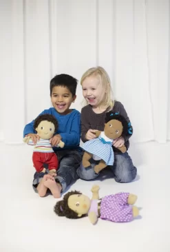 Rubens Barn Cutie Jennifer is een heerlijk zachte pop waar je goed mee kunt knuffelen. Een niet al te grote maat. Ze heeft een prachtig blauw-wit gestreept jurkje met een strikje aan. In het kroeshaar zitten strikjes van dezelfde mooie blauwe kleur.
