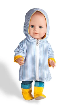 Anorak welke aan 2 zijden draagbaar is. De gele buitenkant geeft de looks van een regenjas en de blauw-wit gestreepte binnenzijde past mooi in een maritieme look.