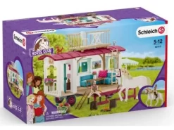 In de caravan kunnen de geheime ontmoetingen plaatsvinden van de vier meiden van de Schleich Horse Club (Lisa, Sarah, Hannah & Sofia).Het dak is afneembaar en het paard kan daaronder vastgezet worden, de meisjes kunnen via de touwladder boven op het dak op het balkonnetje zitten of zich lekker in de caravan nestelen in de zachte kussens van de bank. Zouden ze het geheime vak al ontdekt hebben? Inclusief paard en ruiter.