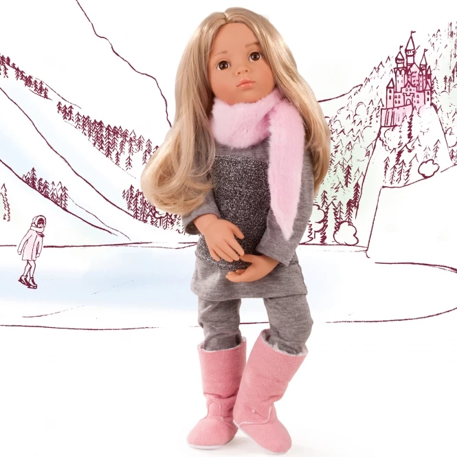 Speelpop Emily heeft grote bruine ogen met lange wimpers en lang blond haar. Ze ziet er glamorous uit in haar grijs-rose outfit met een jurk vol glitters op een legging en een roze pluche sjaal. Aan haar voeten heeft ze roze laarsen! Poppenkleren kunnen makkelijk aan- en uitgetrokken worden.