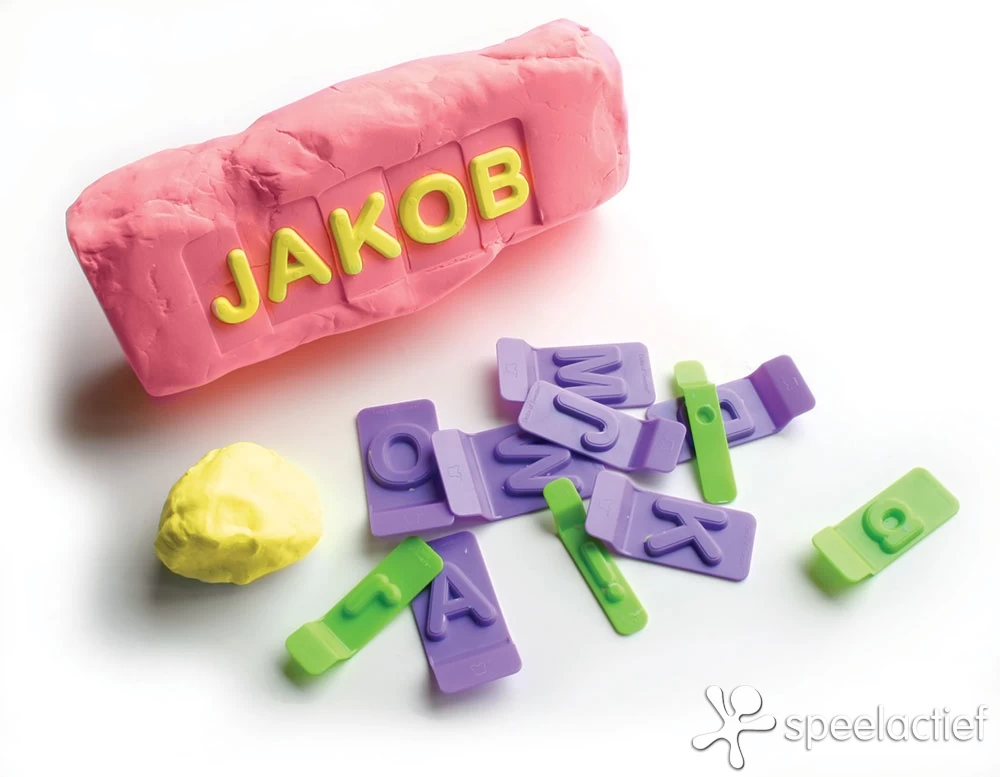 Uitgebreide stempelset die goed bruikbaar is in combinatie met Bubber boetseerklei, kinetisch zand. compleet alfabet, cijfers en ook speciale tekens en hoofdletters.