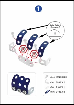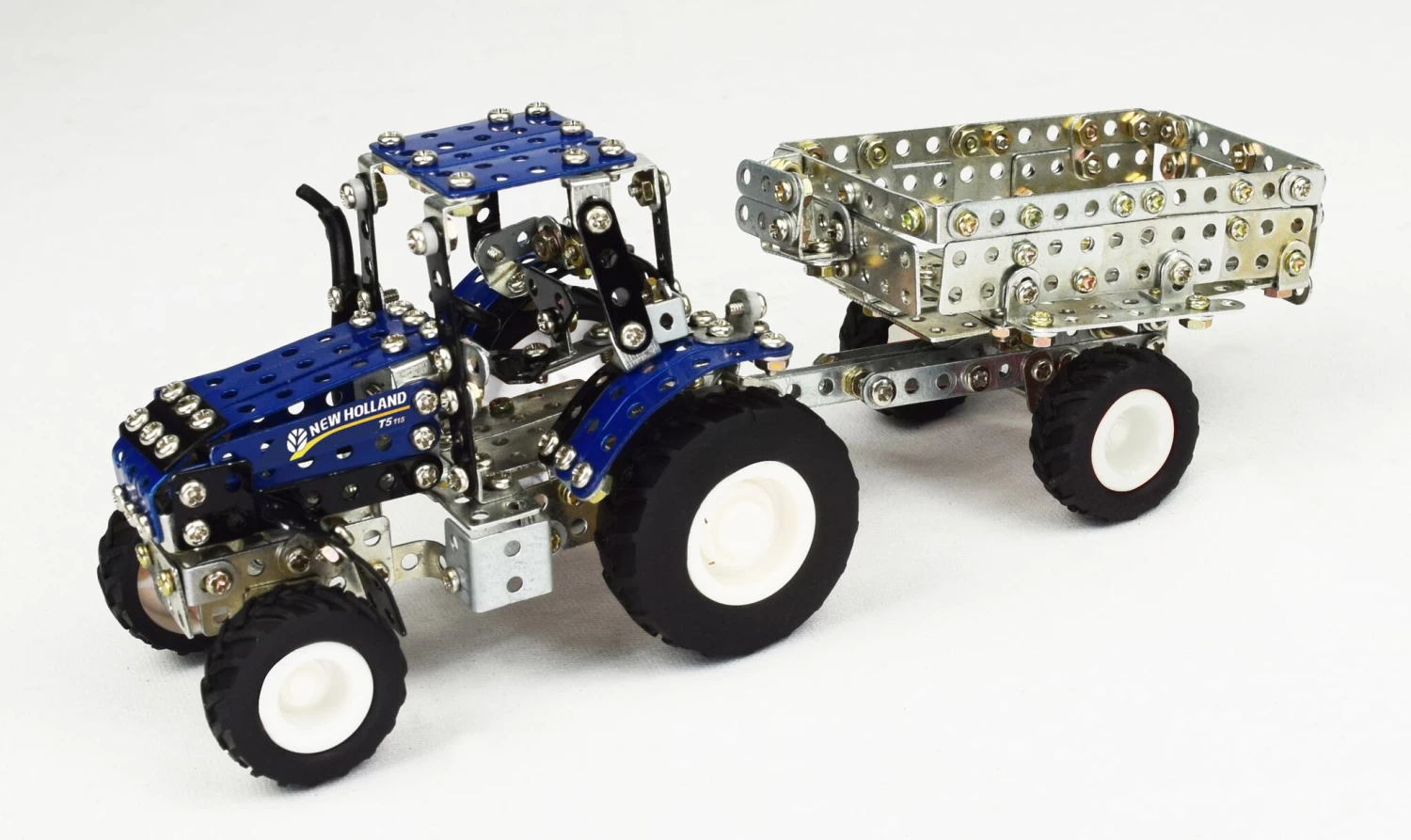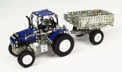 Bouwdoos met 581 onderdelen uit de Tronico Micro serie. Betreft de tractor New Holland T5-115 met kipaanhangwagen.